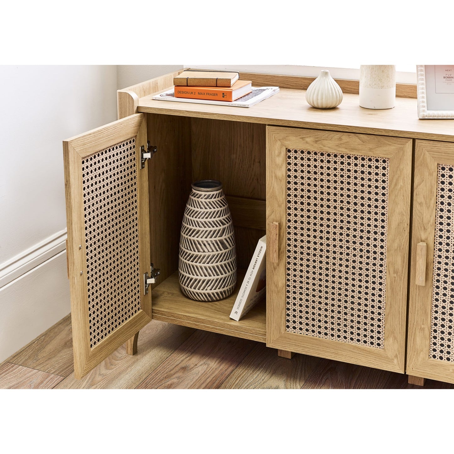 Showcasing a beautifully sleek design with a bohemian feel, the Sydney 3 Door Sideboard offers exquisitely curved edging accompanied by a raised lip around the edge providing a practical addition, stunningly combined with a rattan-effect sticker front. Finished with a natural oak effect featuring three cupboards with built-in shelving allowing you to store key necessities plus extra space on top to place ornaments. All around creating the perfect airy, warm feel within your home.