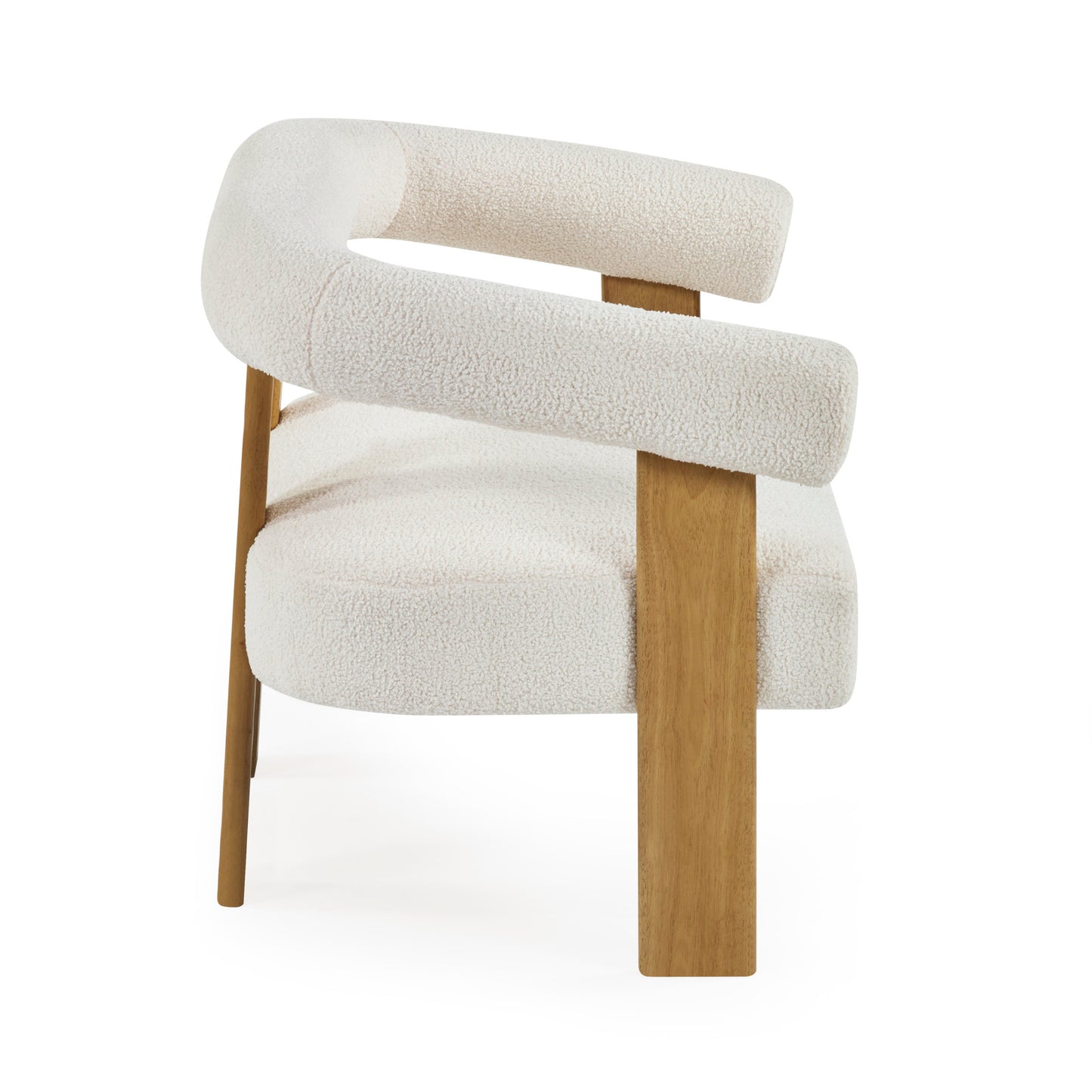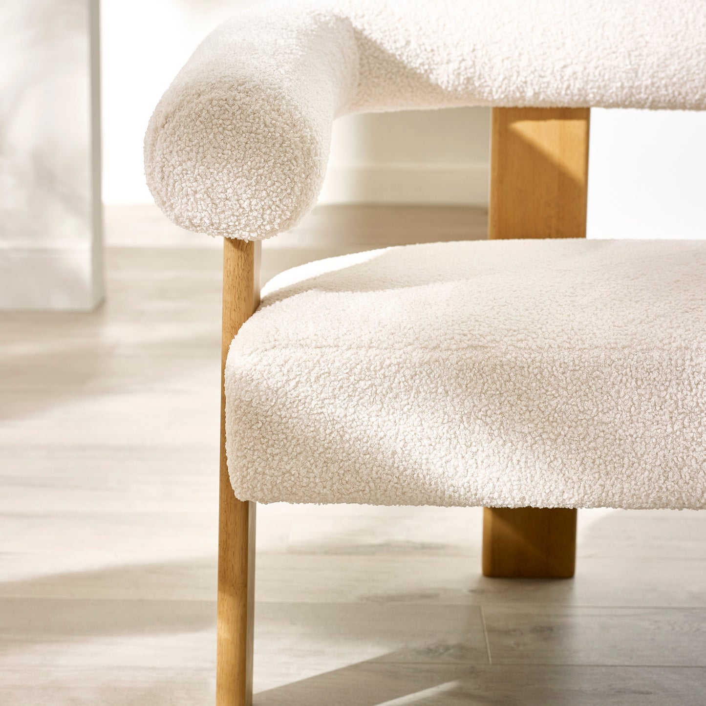 "The Freya 2 Seater Chair brings sculptural softness to your living space, combining clean architectural lines with inviting comfort. Upholstered in beautifully textured white boucle-style fabric, its gently curved wraparound arms create a cocooning silhouette that feels both contemporary and effortlessly relaxed.