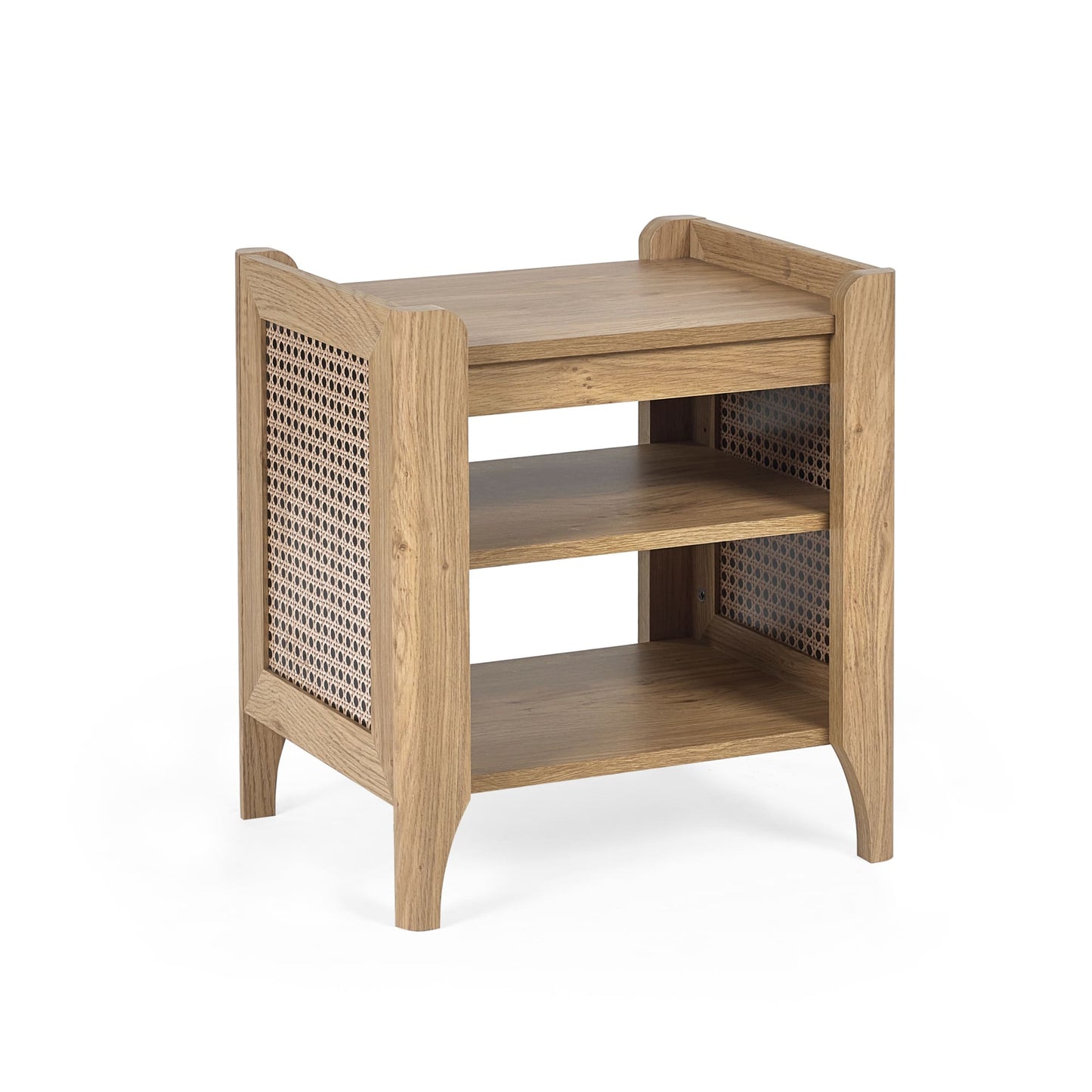Showcasing a beautifully sleek design with a bohemian feel, the Sydney Lamp Table offers exquisitely curved edging accompanied by a raised lip around the edge providing a practical addition, stunningly combined with a rattan-effect sticker front. Finished with a natural oak effect featuring a removable shelf allowing you to store key essentials both on the top and bottom of the table. All around creating the perfect airy, warm feel within your home.