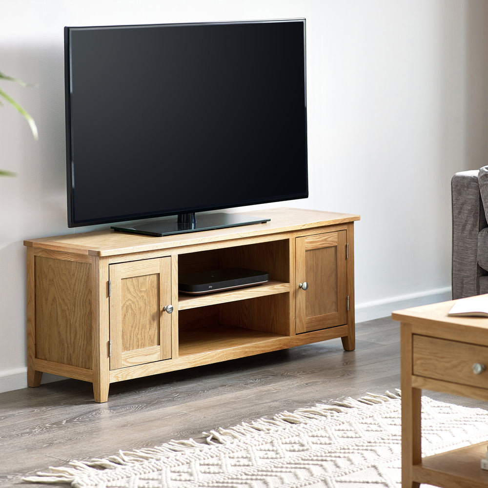 The Mallory Widescreen TV Unit is crafted from solid oak and oak veneers giving a simple and stylish design that complements any living space. Featuring two cupboards and two shelves ideal for storing consoles