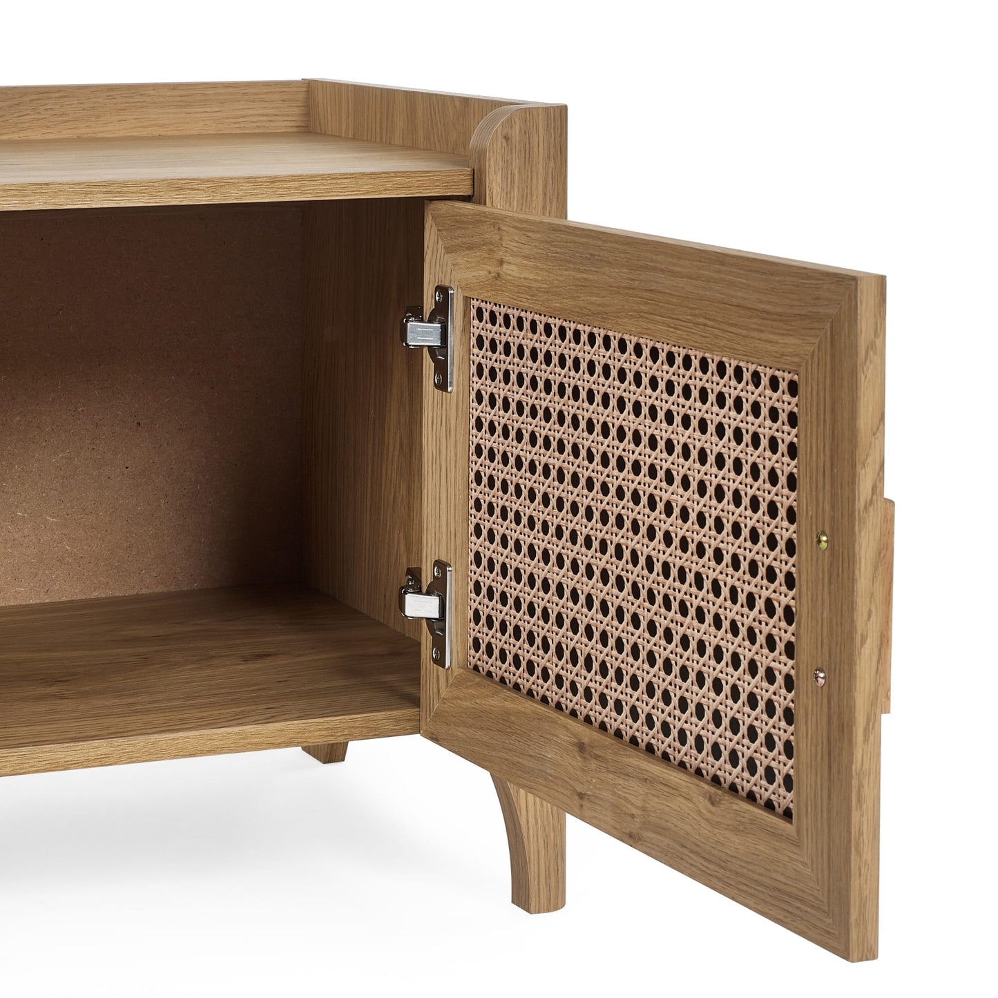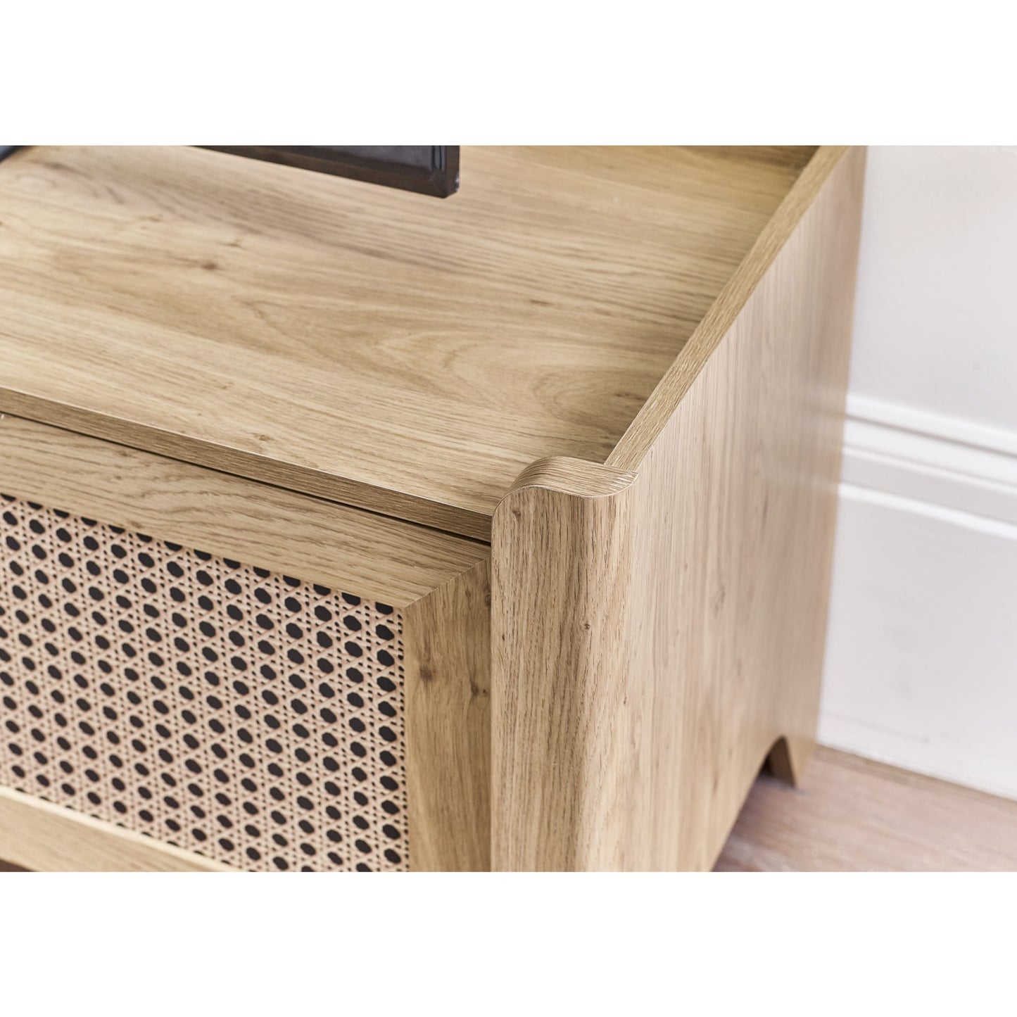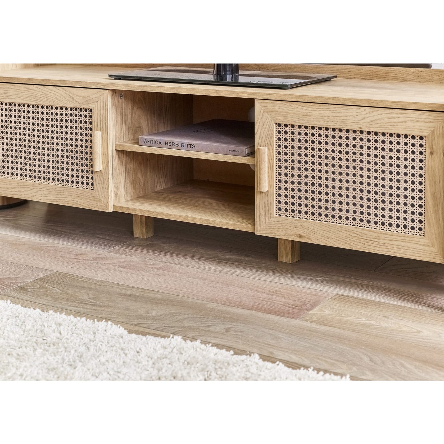 Showcasing a beautifully sleek design with a bohemian feel, the Sydney Media Unit offers exquisitely curved edging accompanied by a raised lip around the edge providing a practical addition, stunningly combined with a rattan-effect sticker front. Finished with a natural oak effect which is composed of two large storage cupboards and built-in shelving providing you plenty of space for controllers and TV monitors. All around creating the perfect airy, warm feel within your home.