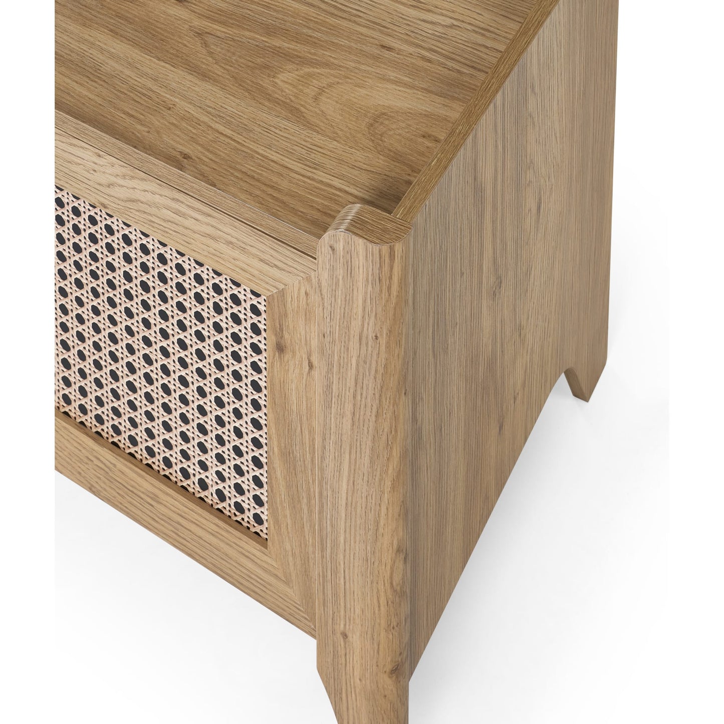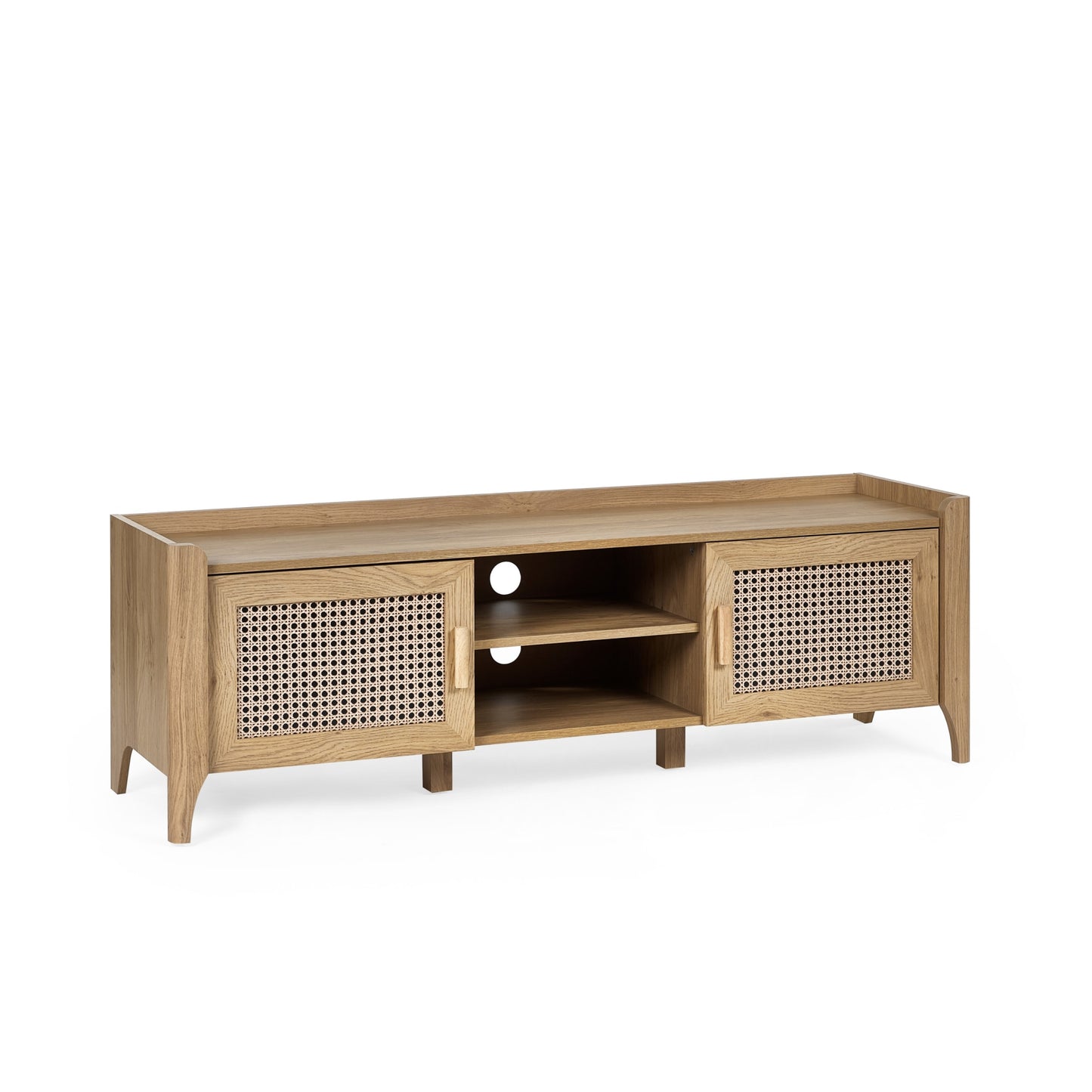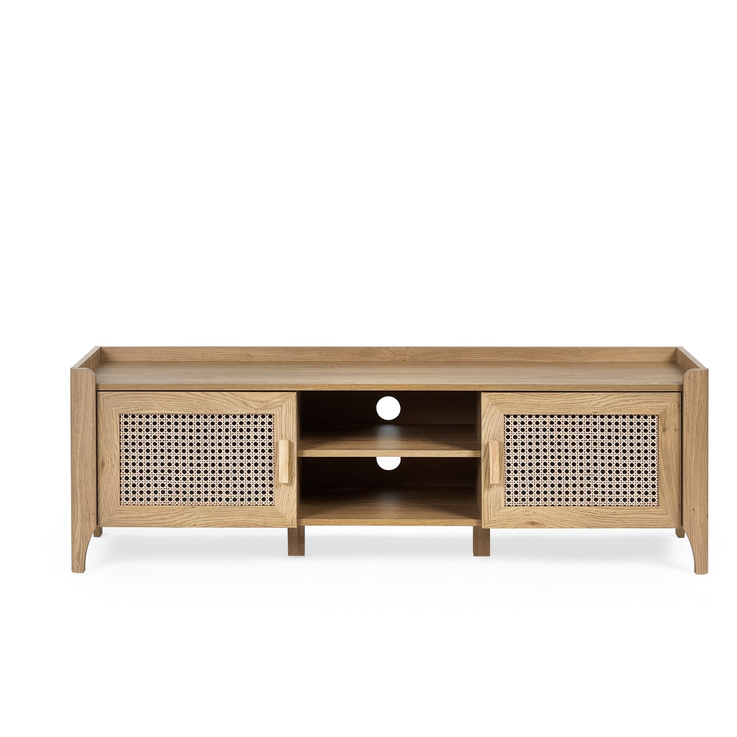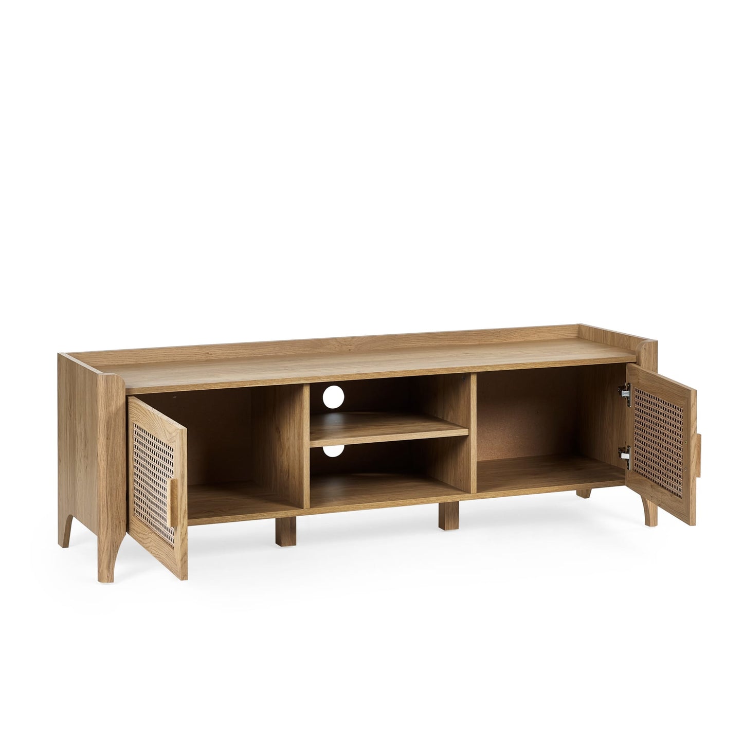 Showcasing a beautifully sleek design with a bohemian feel, the Sydney Media Unit offers exquisitely curved edging accompanied by a raised lip around the edge providing a practical addition, stunningly combined with a rattan-effect sticker front. Finished with a natural oak effect which is composed of two large storage cupboards and built-in shelving providing you plenty of space for controllers and TV monitors. All around creating the perfect airy, warm feel within your home.
