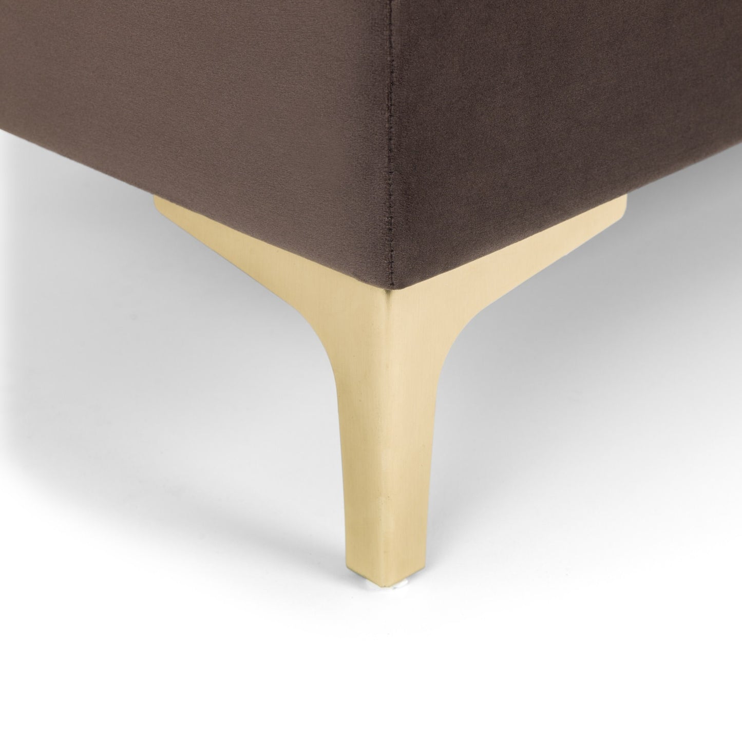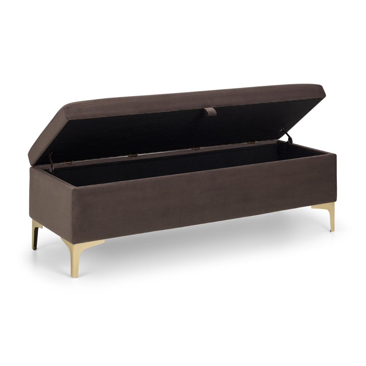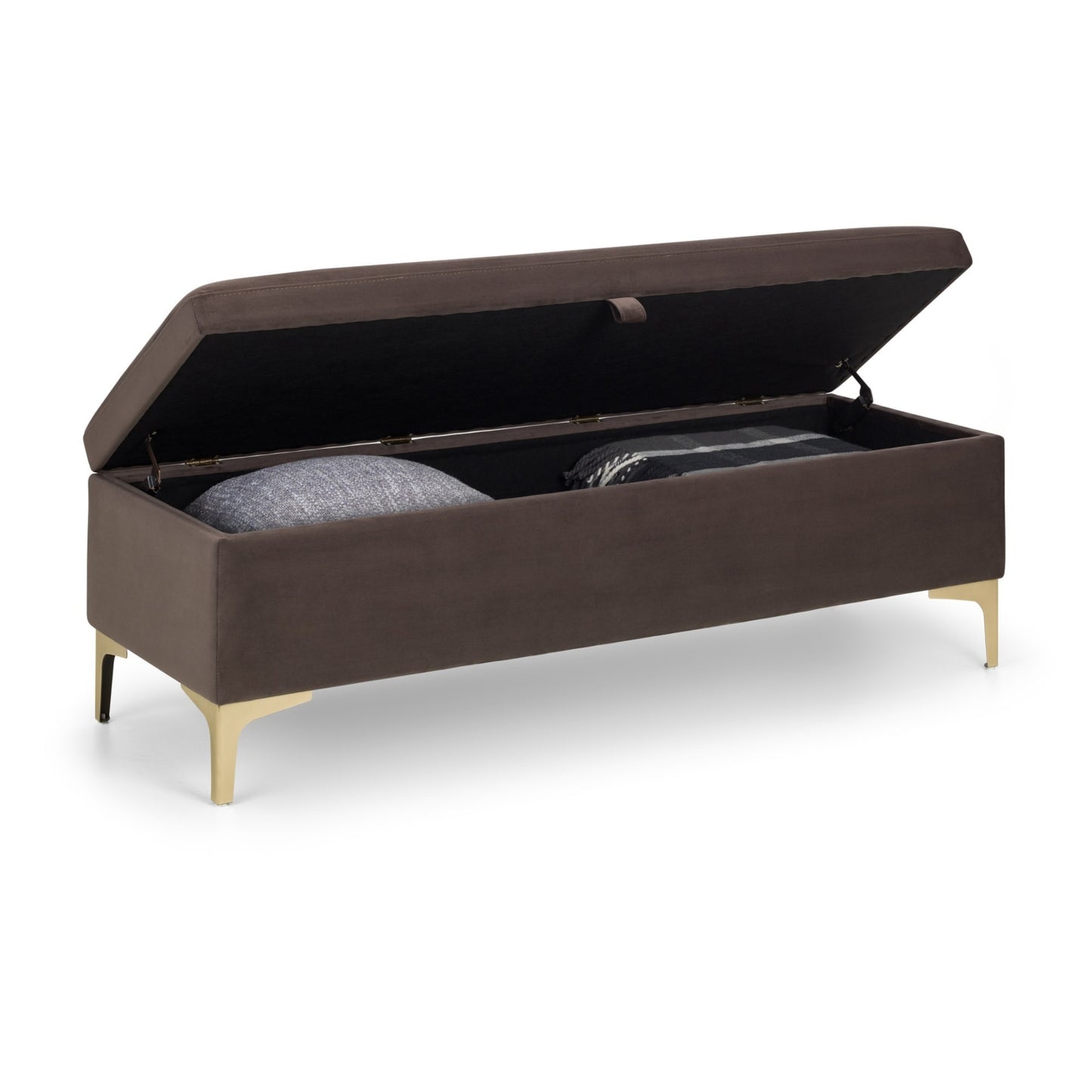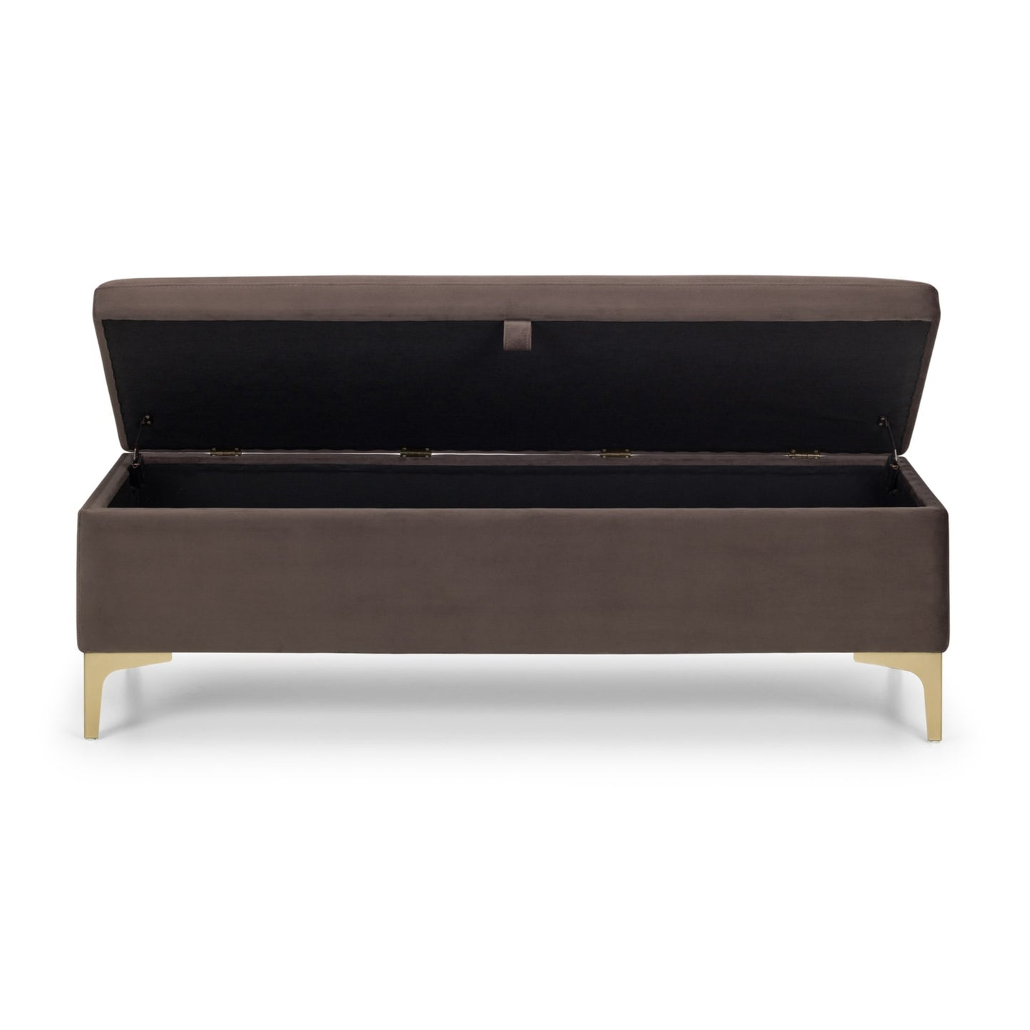 Perfectly proportioned to sit at the end of the Julian Bowen Deco bed, this contemporary Deco blanket box is upholstered in a truffle velvet fabric with complimentary gold metal legs. This contemporary design offers a unique, timeless appeal. The perfect storage for your cushions, linens, or duvets with the ease of soft close hinges.