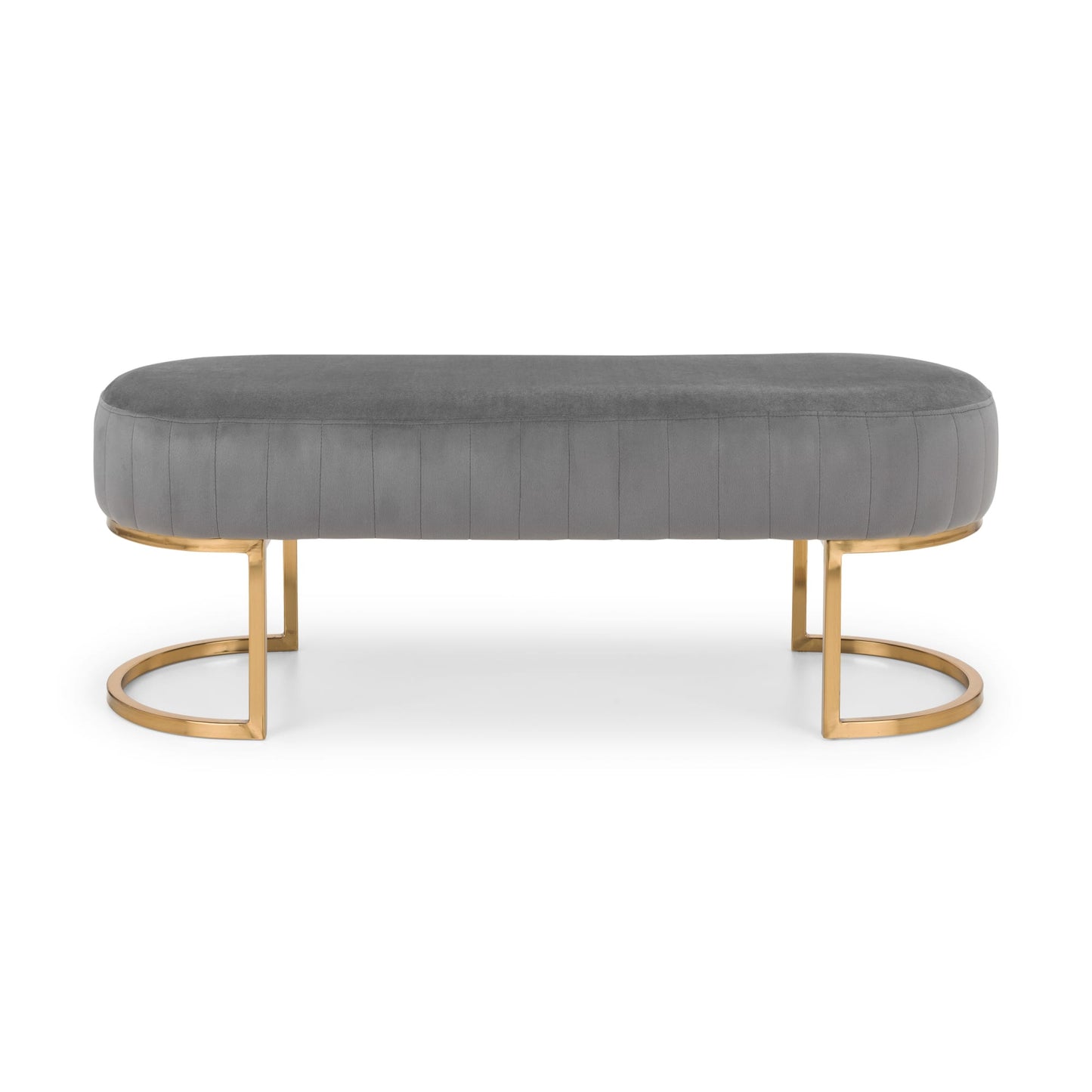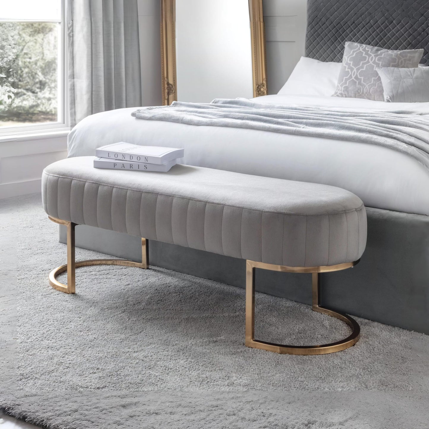 Designed in a luxury velvet, our Harrogate bench features an elegant, unique design that fits beautifully amongst a large range of interior décor styles. The contrast of the slick gold legs make this piece versatile, yet classy. Whether placed in the bedroom, or part of the hallway, this piece is sure to be a showstopper in any home.