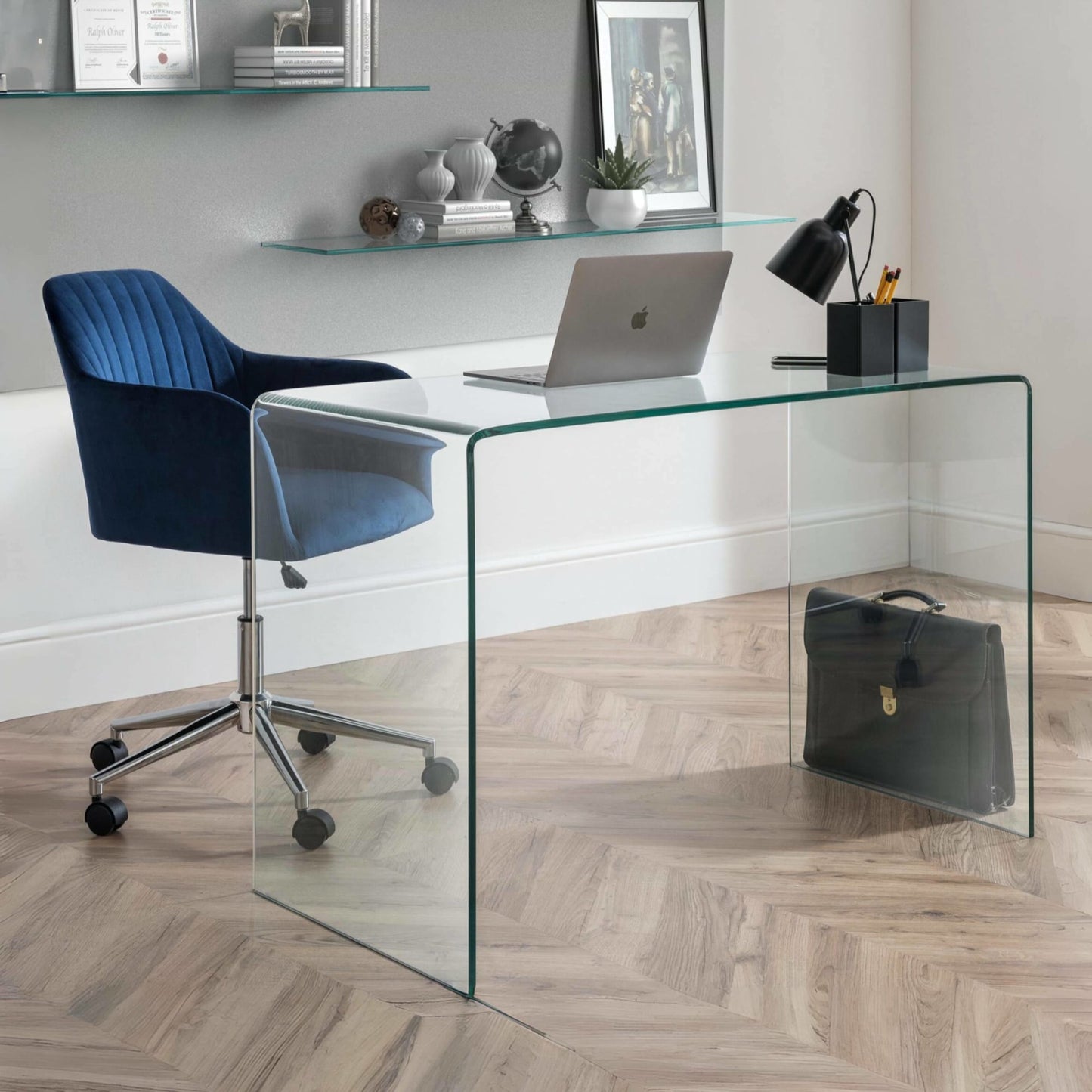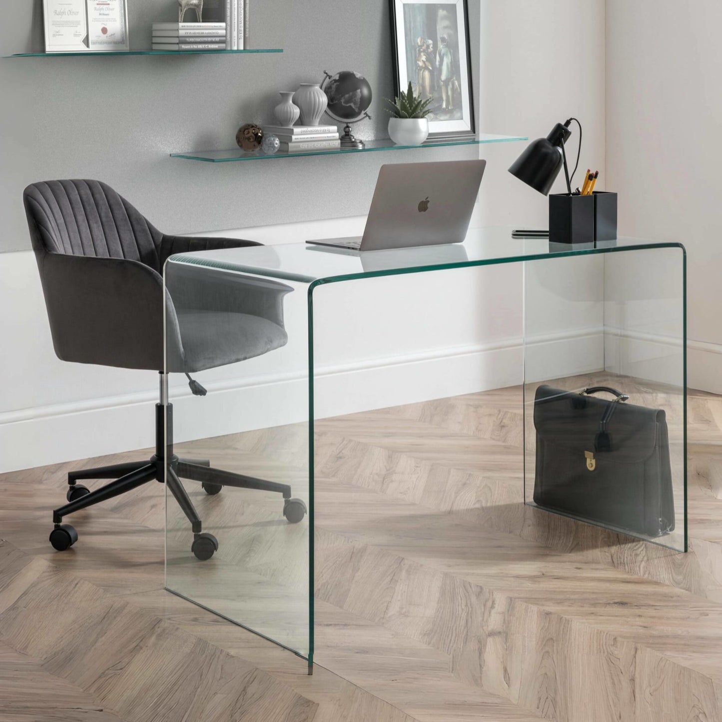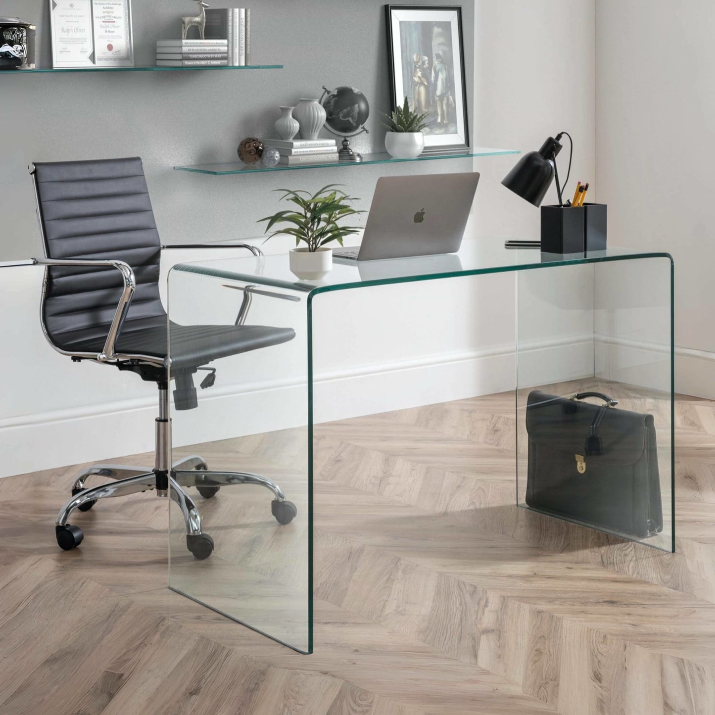 This Amalfi bent glass desk is beautifully crafted from a single sheet of tempered glass, bent and moulded into a curvaceous design with no joins or fixings. From a collection of three pieces, the Julian Bowen Amalfi clear glass range will create the feeling of more space in your home, whilst adding a touch of elegance.