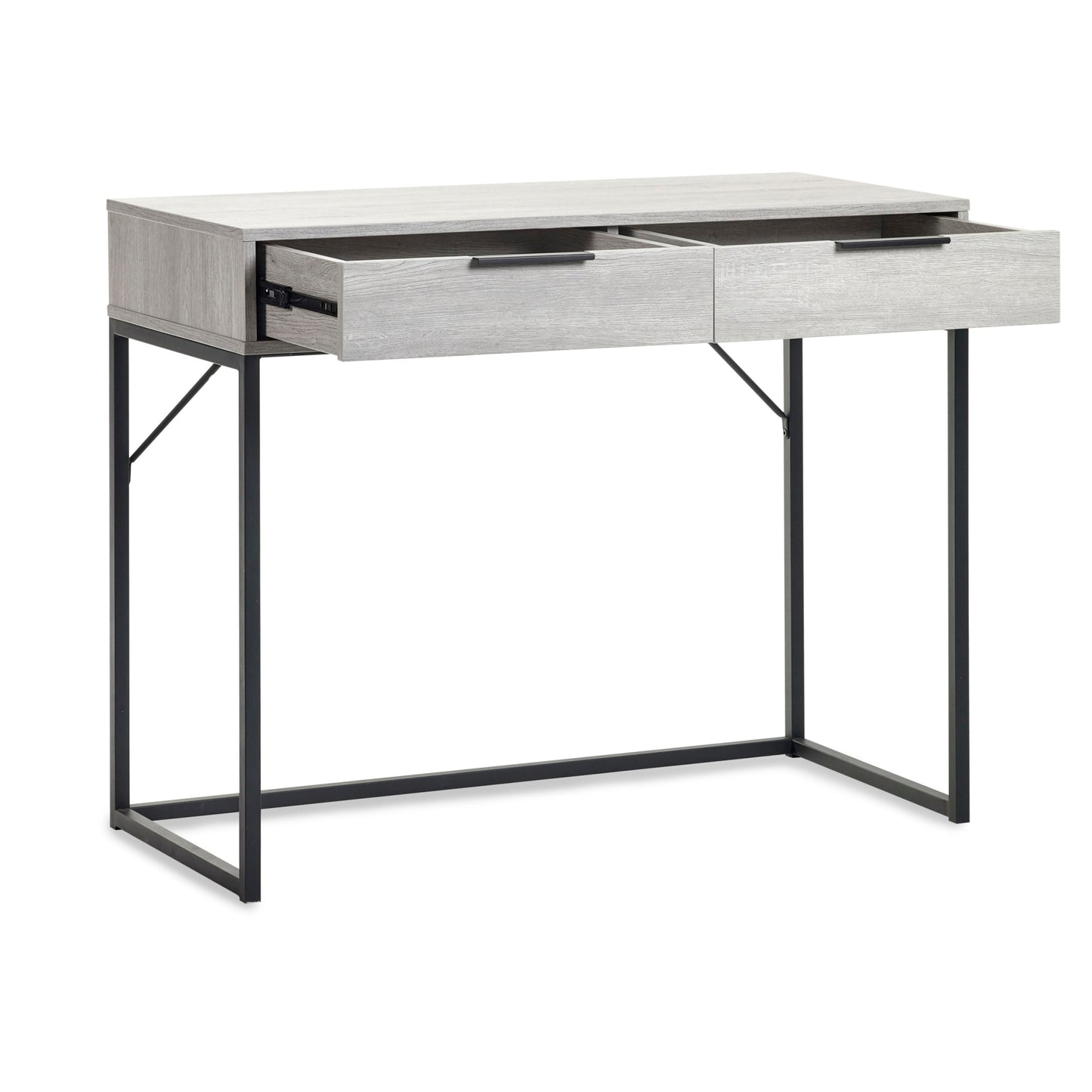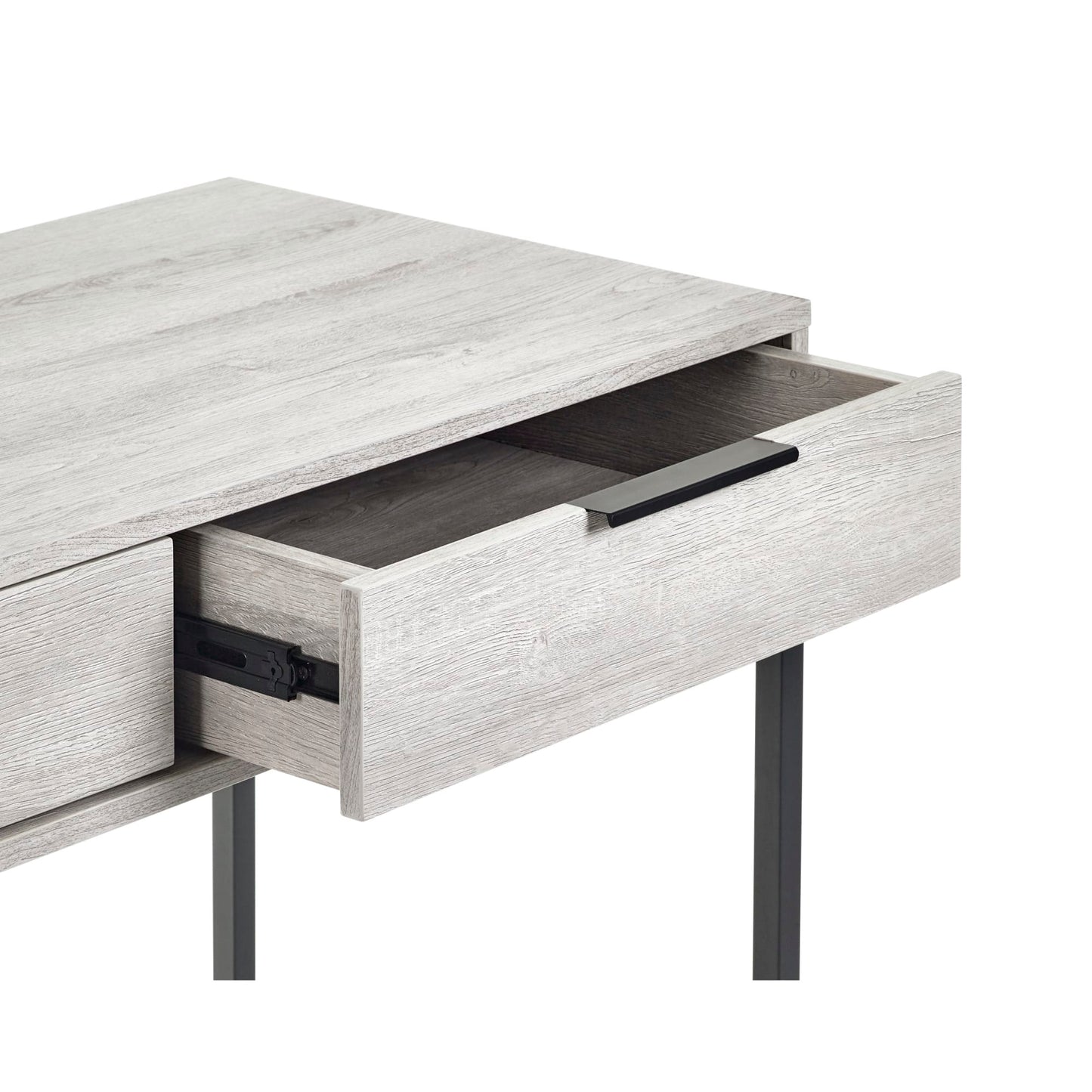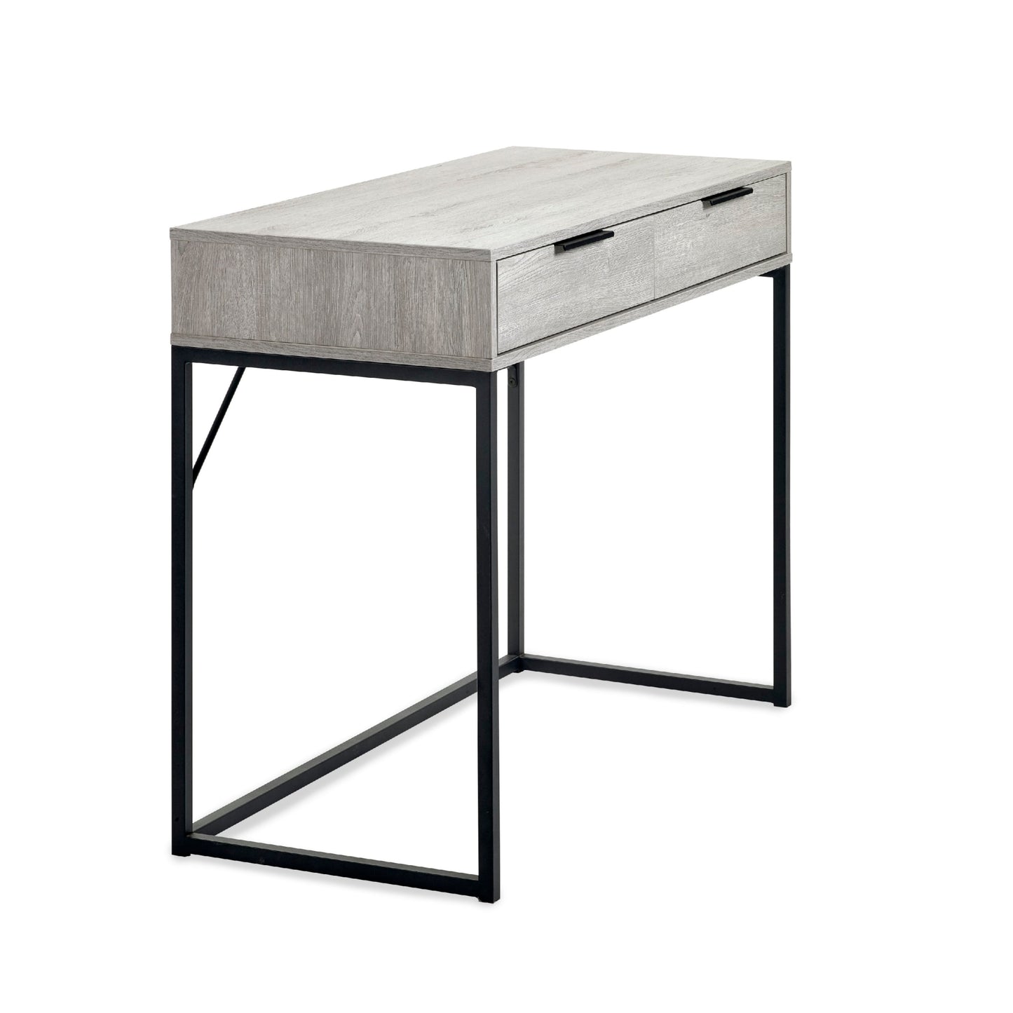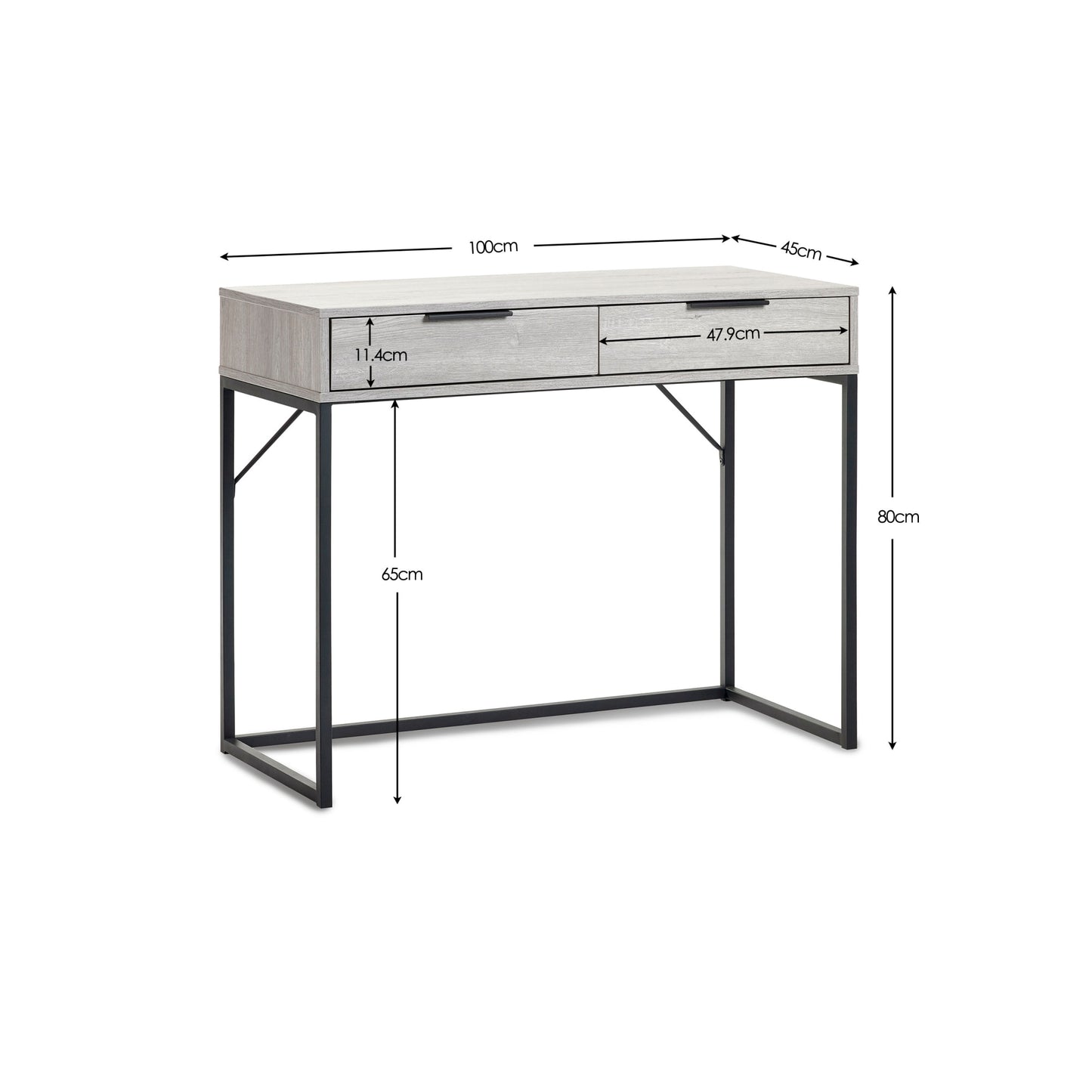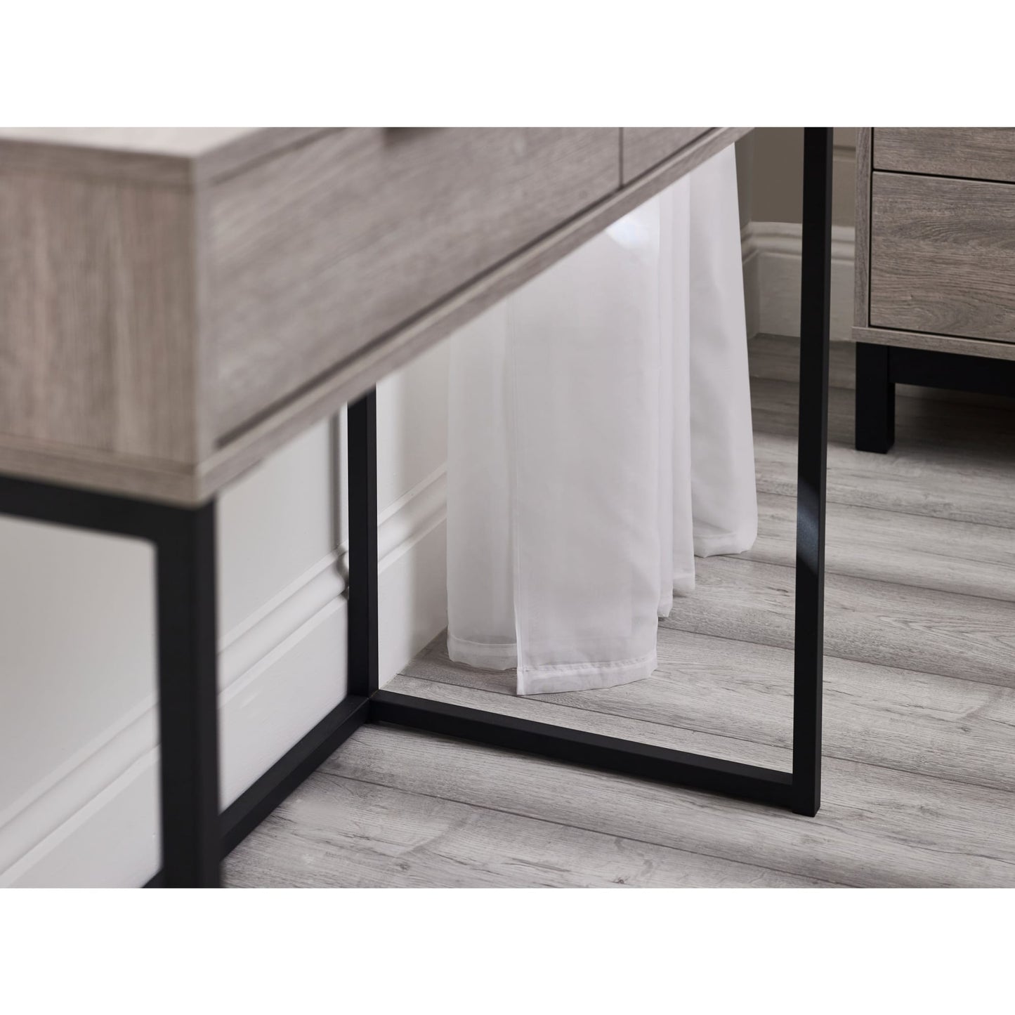 - Modern grey oak finish with contrasting black legs and handles.