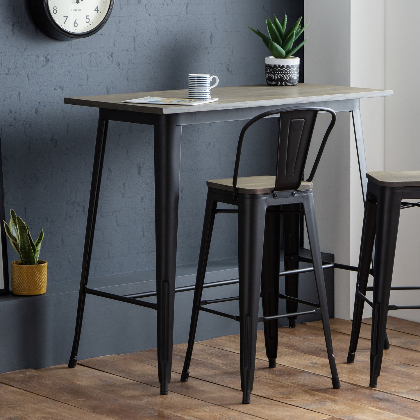 Crafted from solid Elm wood and satin black powder coated steel, The Grafton Bar Table offers a suitable dining or drinking area for up to 4 people. Pair up with the Grafton Bar Stools to add a modern, industrial feel to any room.