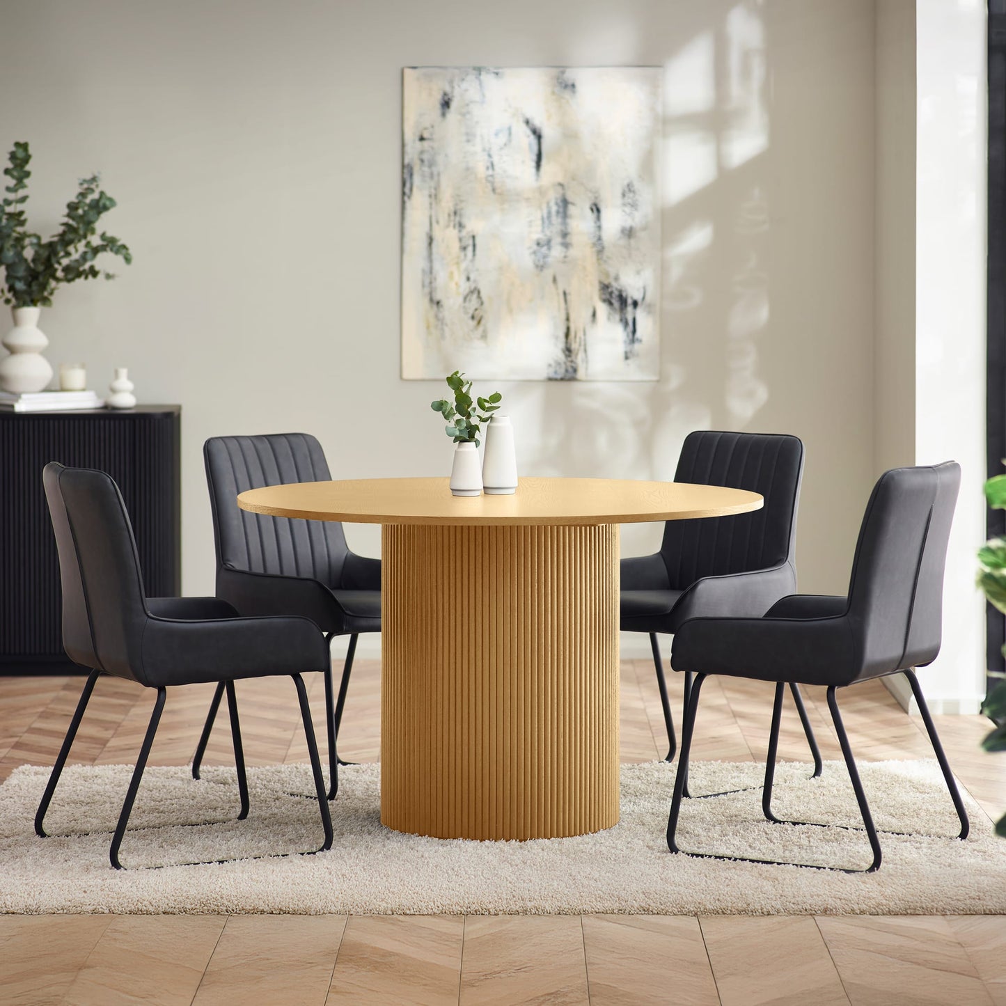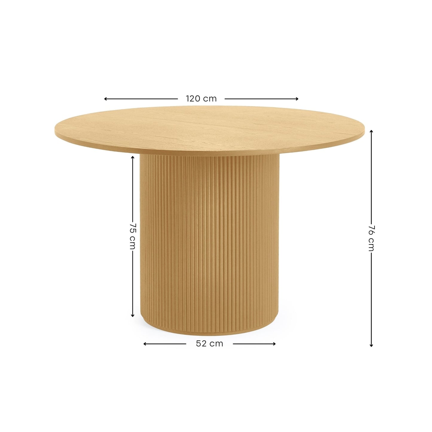 Bring warmth and natural elegance to your dining space with this round dining table in light oak effect. Its generous circular top offers plenty of room for family meals or entertaining guests, while the fluted pedestal base adds refined texture and a touch of sophistication. The soft, natural finish complements a variety of interiors, creating a welcoming and stylish focal point. Designed for both practicality and timeless appeal, minimal assembly is required for a quick and effortless setup.