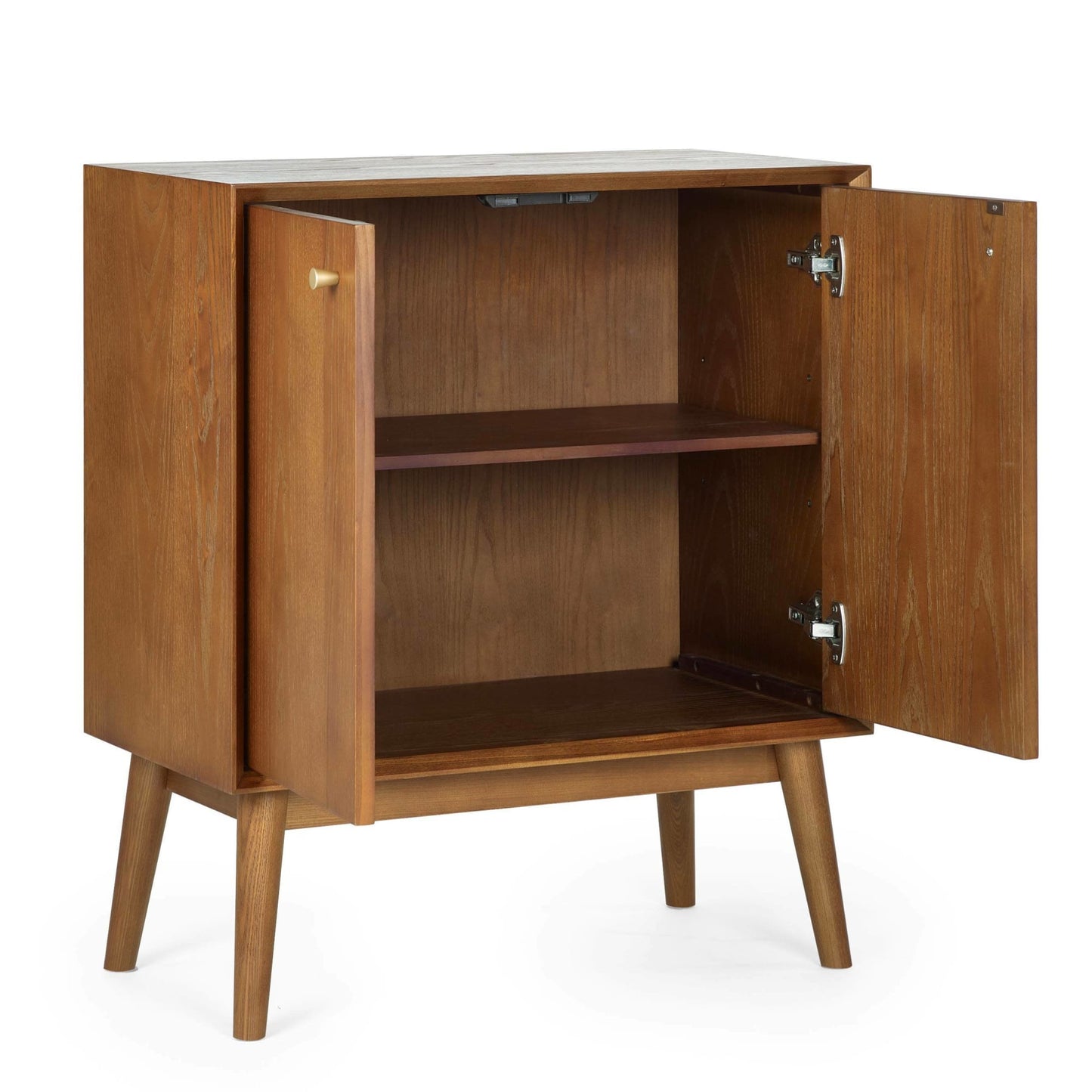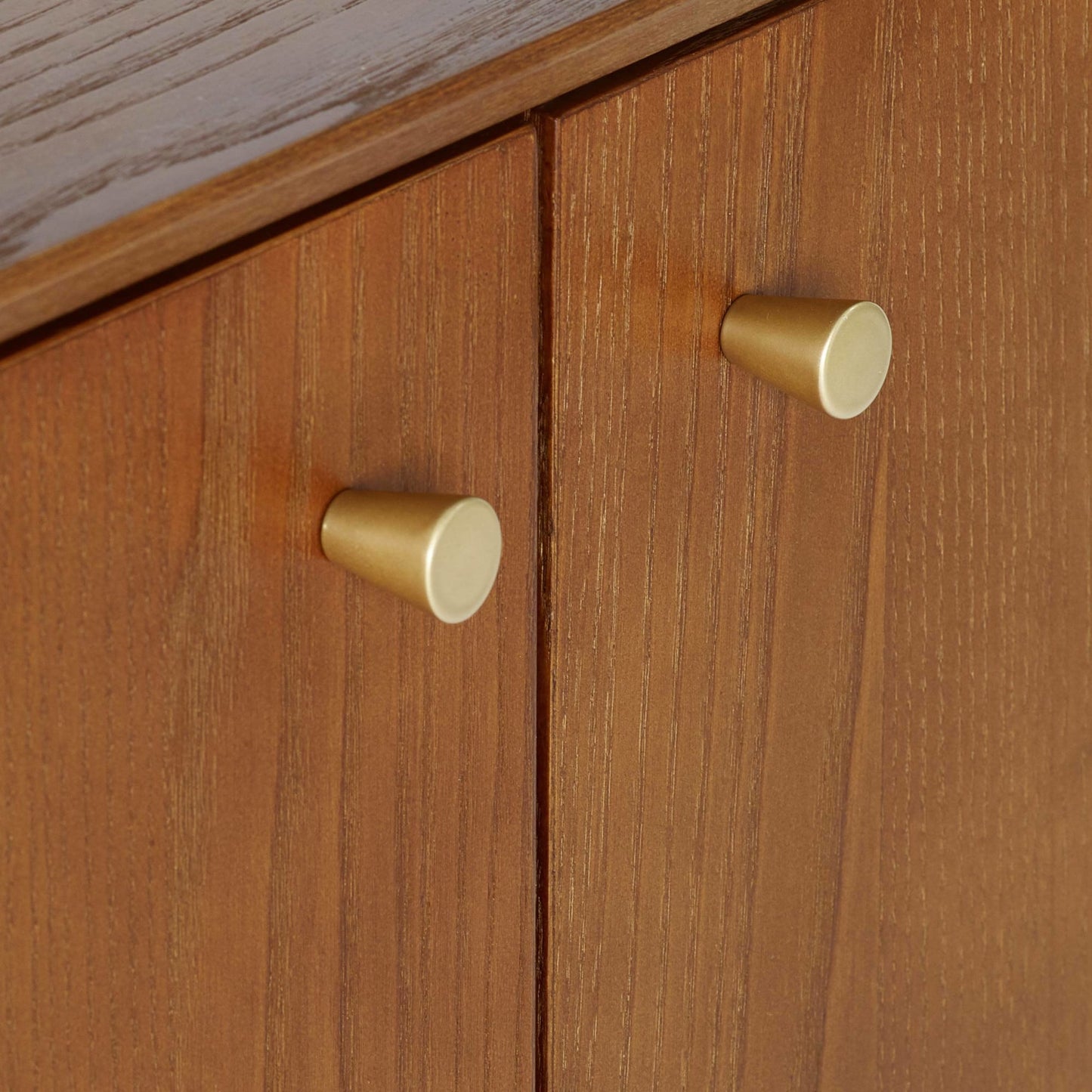 A gorgeous retro-inspired style, the Lowry Small Sideboard is constructed from an exquisite cherry ash wood veneer with beautifully tapered legs. Featuring soft-touch cupboard doors and interior shelving, ideal for storing necessities. Complemented by gold framed knobs, providing the perfect timeless staple to any occasional space.