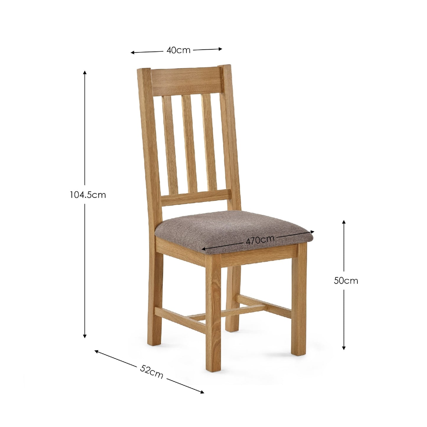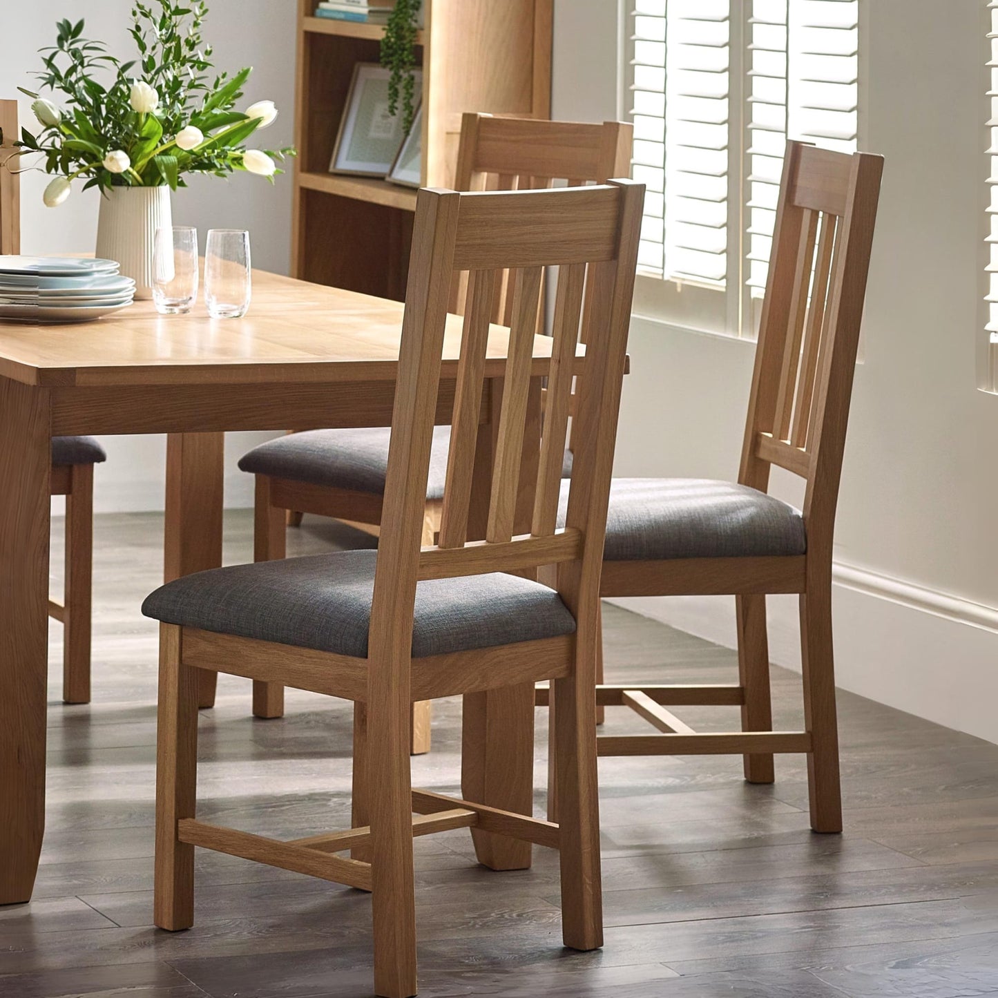 The Mallory Dining Chair features a slatted back that is angled for support allowing for comfort and durability. Crafted from solid oak and oak veneers with a grey seat pad, this dining chair combines a simple and stylish design. Perfect match for the Mallory Extending Dining Table.
