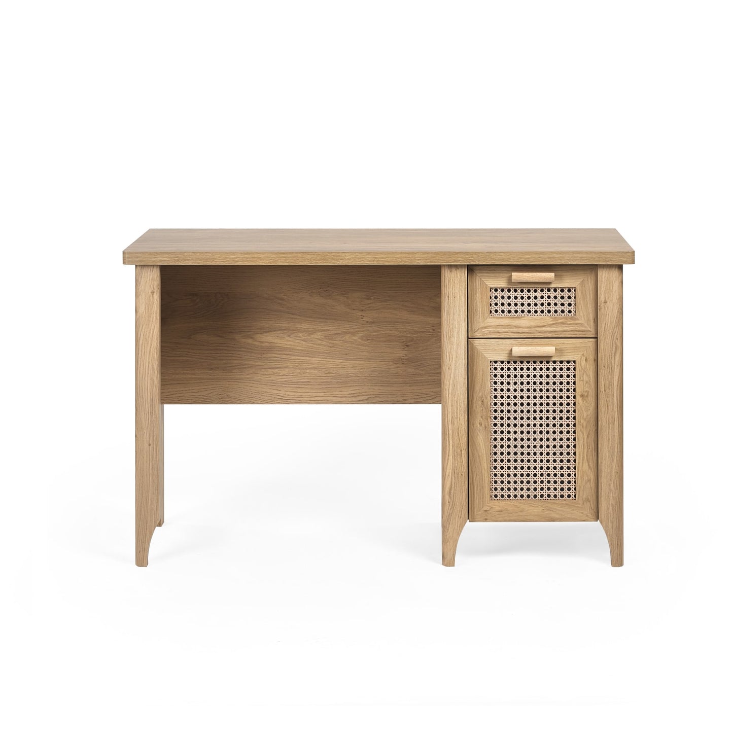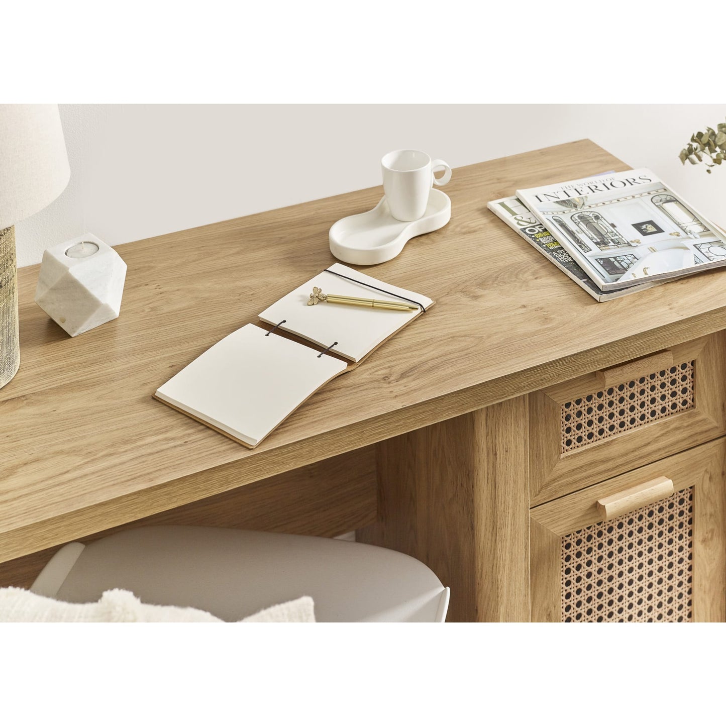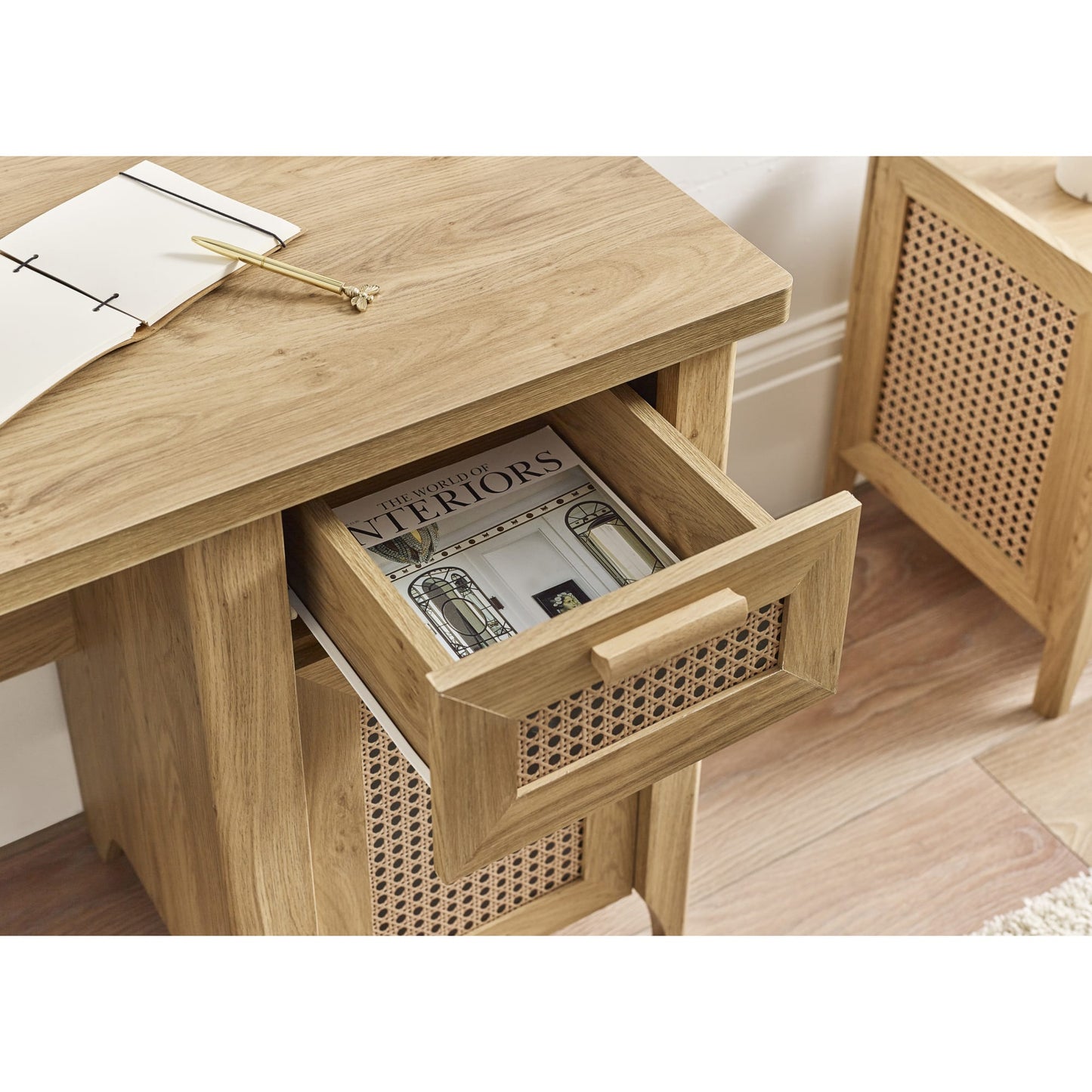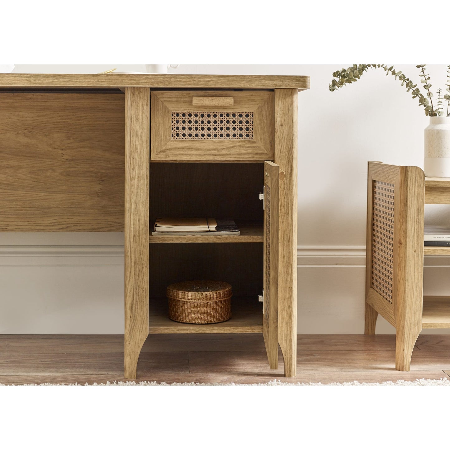Showcasing a beautifully sleek design with a bohemian feel, the Sydney Desk offers exquisitely curved edging with gentle soft lines stunningly combined with a rattan-effect sticker front. Finished with a natural oak effect featuring one pull-out drawer and one cupboard providing the ideal storage space for stationary essentials. All around creating the perfect airy, warm feel within your home.