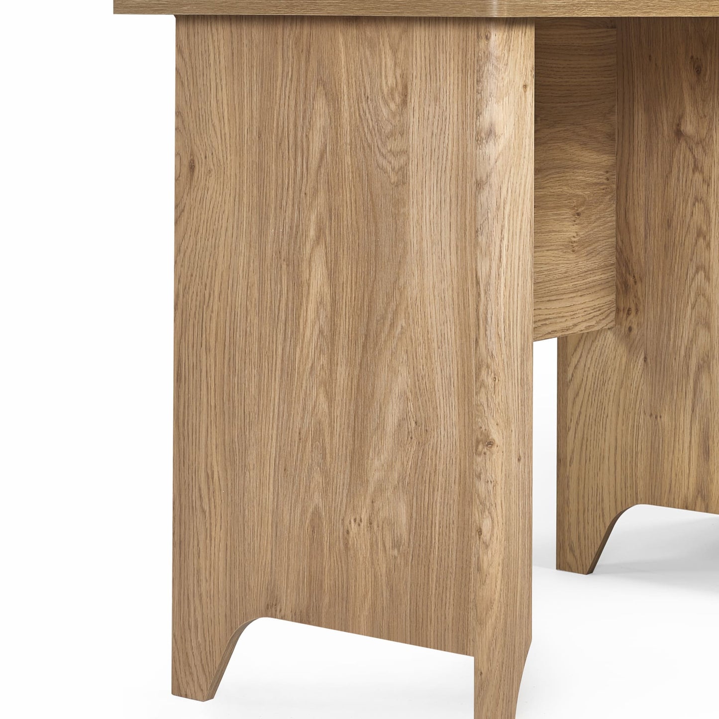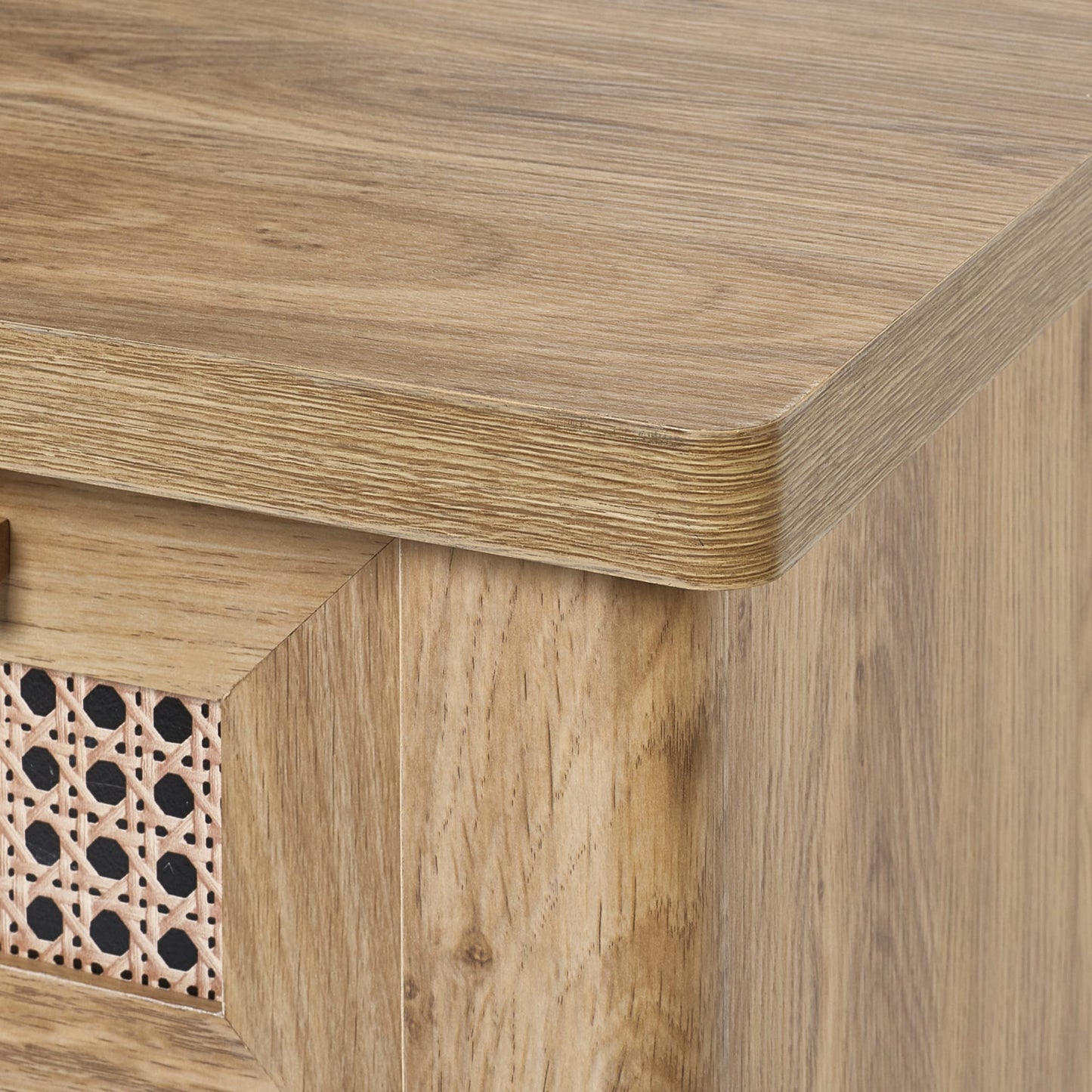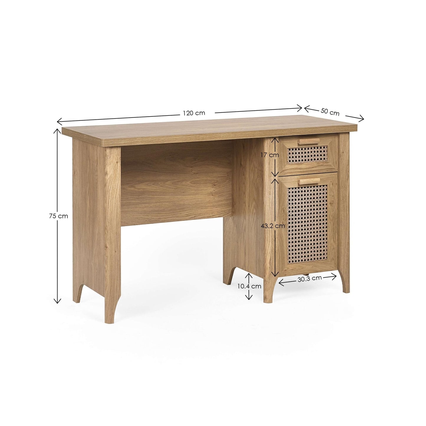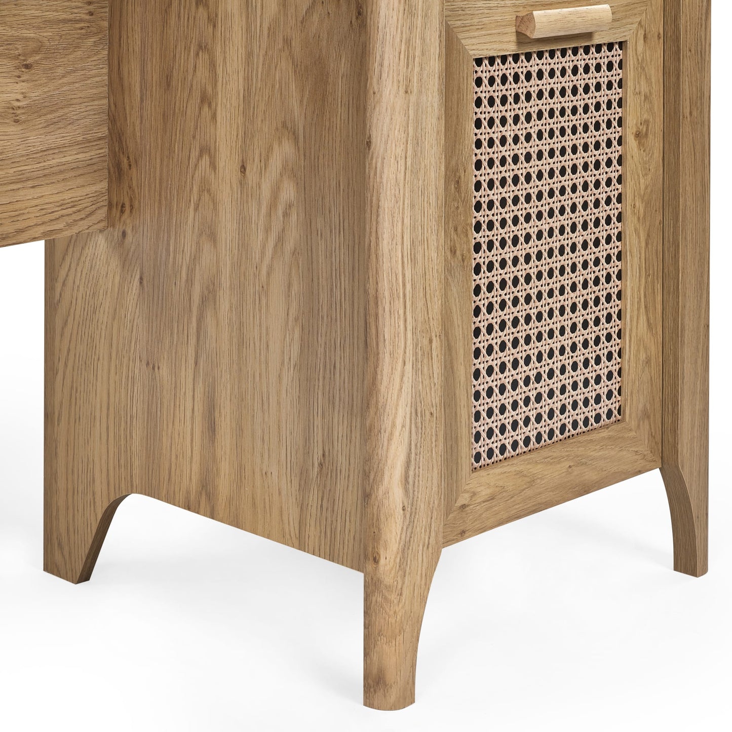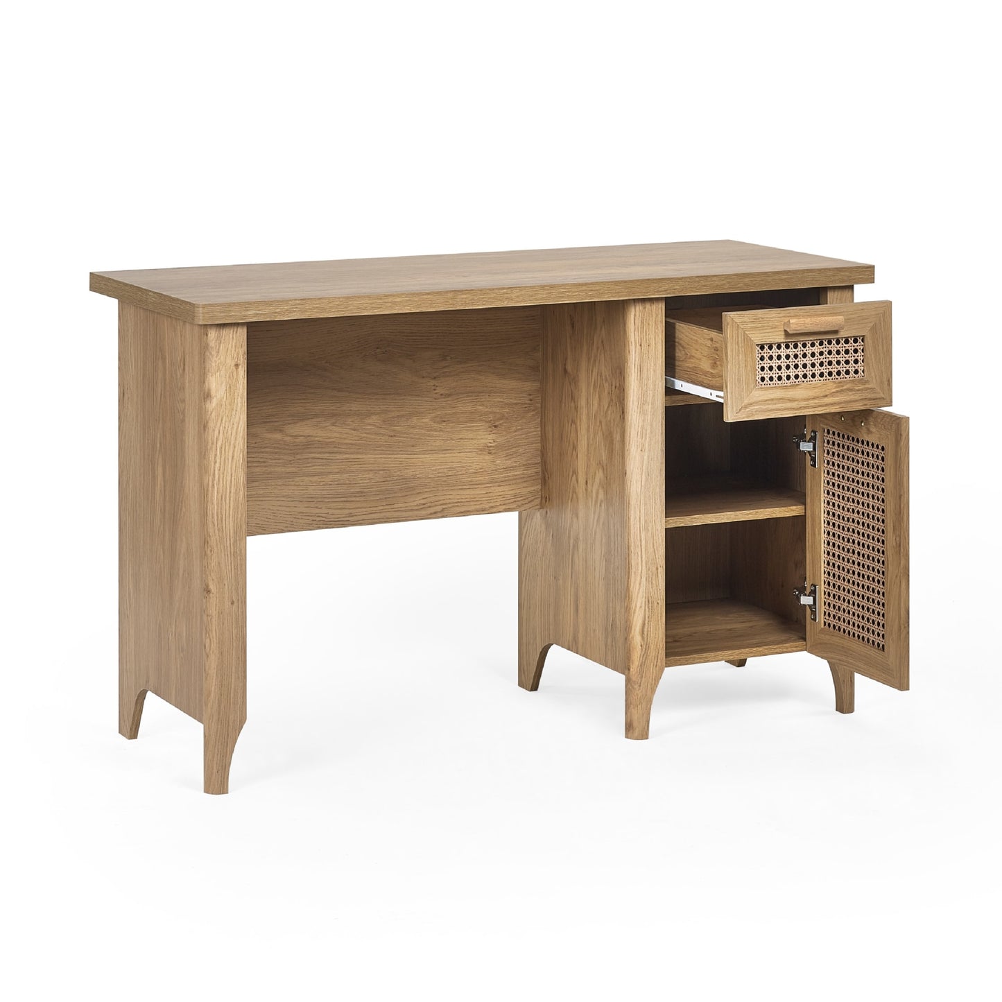Showcasing a beautifully sleek design with a bohemian feel, the Sydney Desk offers exquisitely curved edging with gentle soft lines stunningly combined with a rattan-effect sticker front. Finished with a natural oak effect featuring one pull-out drawer and one cupboard providing the ideal storage space for stationary essentials. All around creating the perfect airy, warm feel within your home.